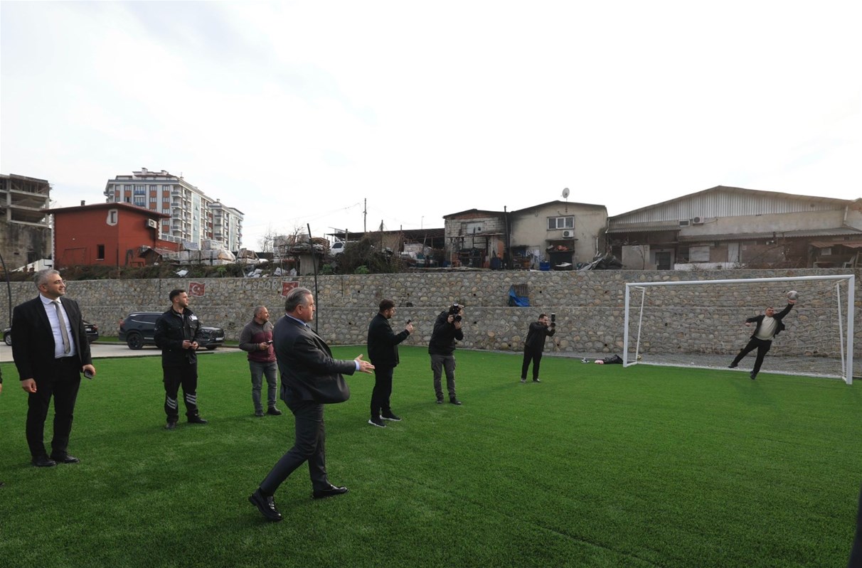 Engindere Mahallesi'nde yapımı tamamlanan futbol sahasında inceleme yapan Bakan Bak, yetkililerden bilgi aldı.