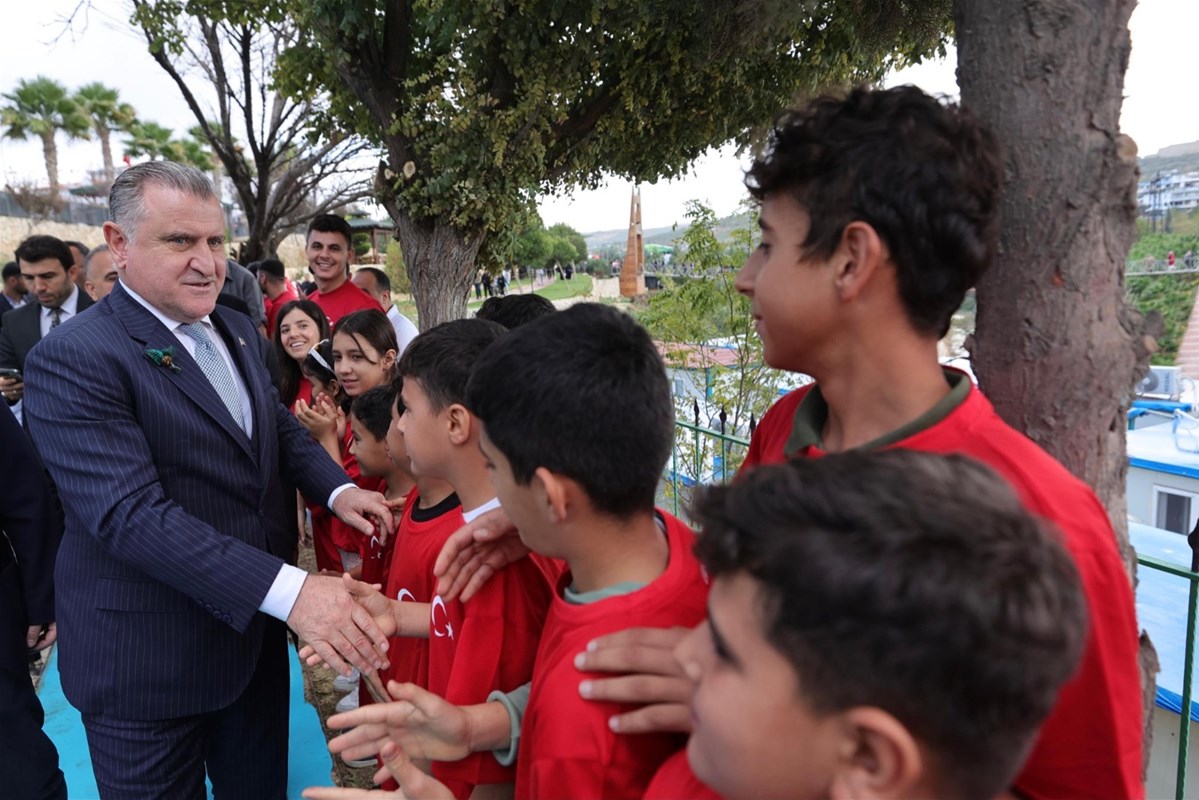 Konuşmaların ardından sahneye çıkan çocuklarla "Kırmızı-beyaz, en büyük Türkiye" sloganı atan Bakan Bak, daha sonra beraberindekilerle Altınözü Gençlik Merkezi'nin temelinin atılması için butona bastı.